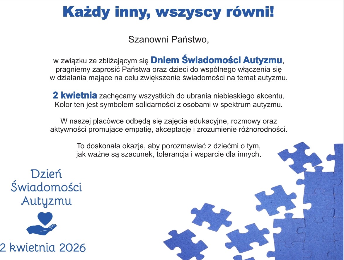 Dnia 20.11.25 r. (czwartek) dzieci z naszego przedszkola wezmą udział w światowych obchodach Międzynarodowego Dnia Praw Dziecka. Prosimy o przygotowanie w tym dniu strojów w kolorze niebieskim lub z elementami niebieskimi. Dziękujemy
