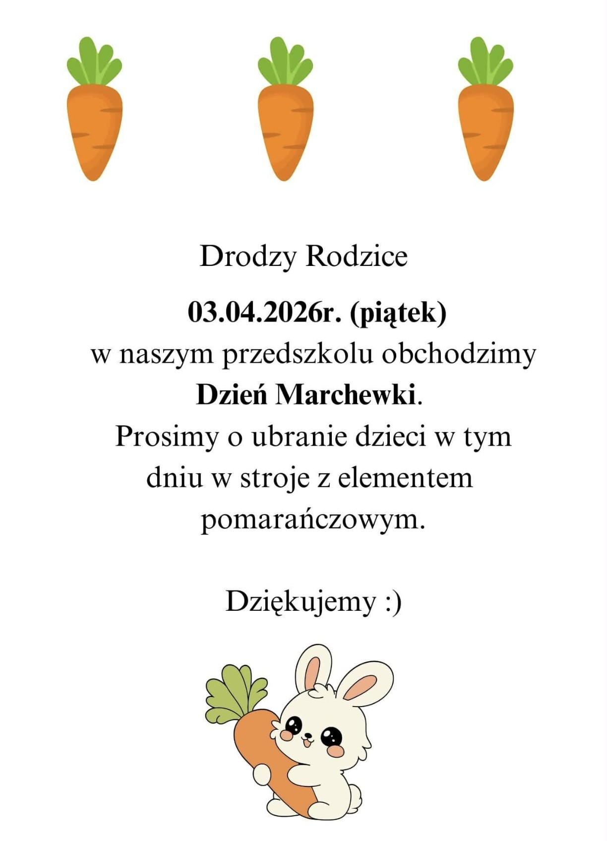 Dnia 21 marca w piątek uroczyście powitamy Pierwszy Dzień Wiosny. W tym dniu mile widziany będzie element zielony lub kwiatowy w stroju dzieci. Dziękujemy.
