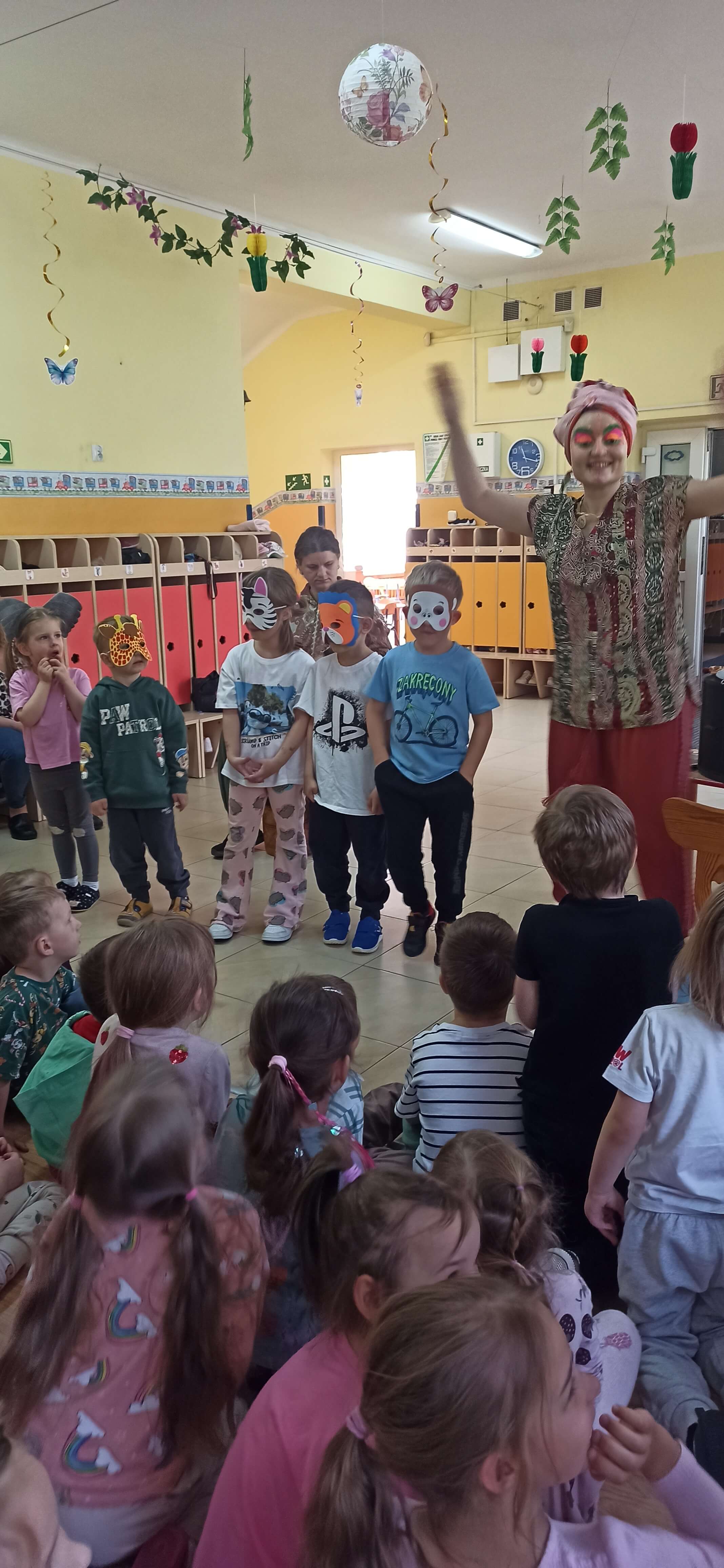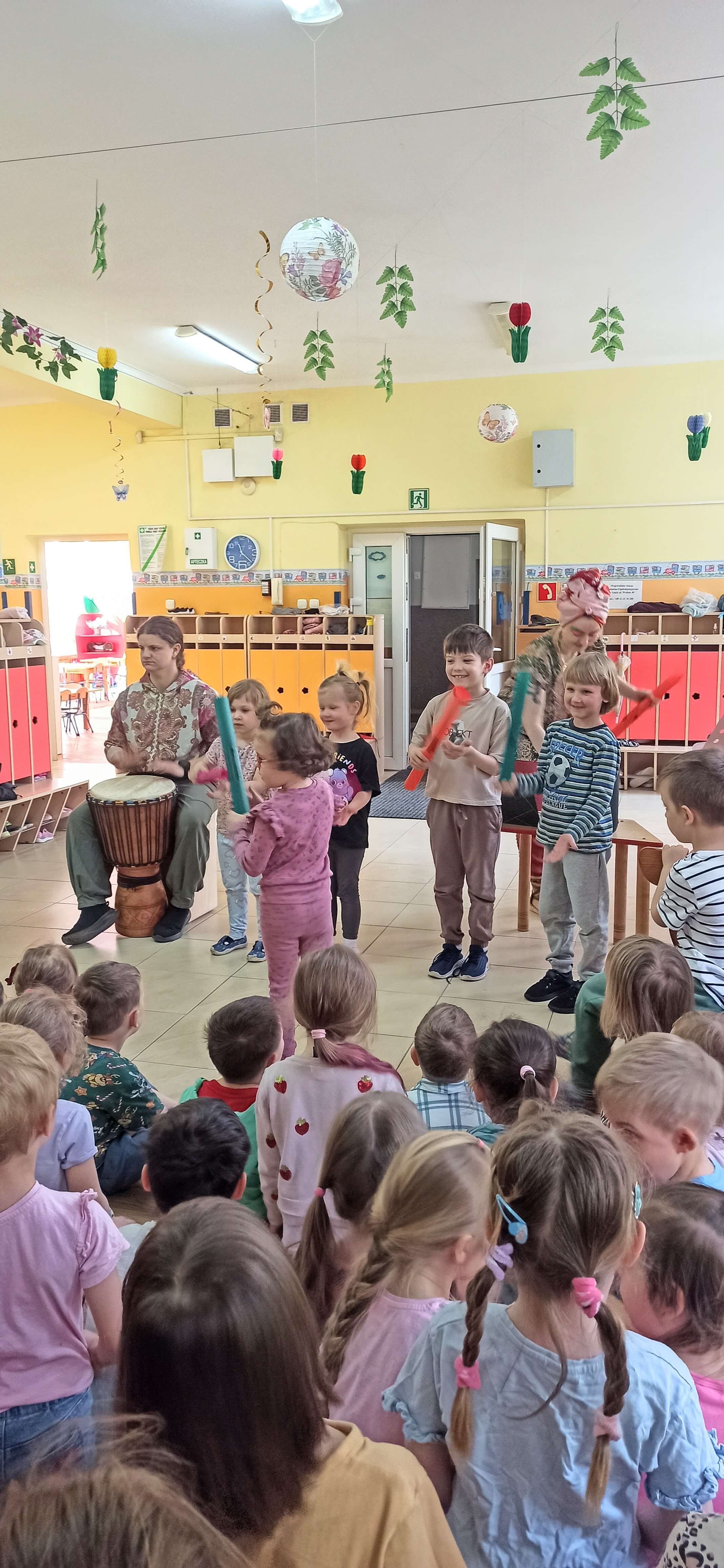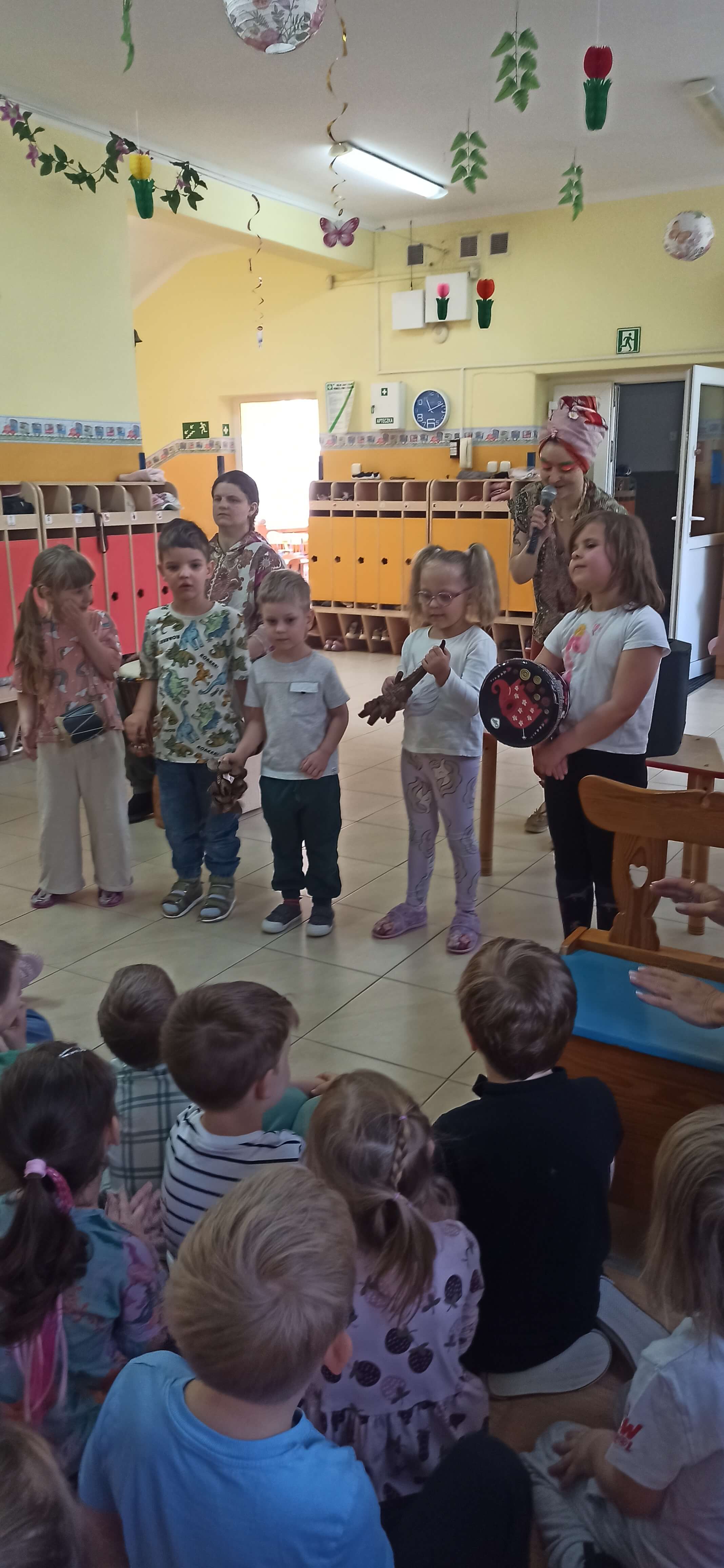 Dnia 24 kwietnia mieliśmy przyjemność uczestniczyć w audycji muzycznej z serii "Audycja z nutką" - Hakuna matata - rytmy Sawanny na bębnach. Dzieci z ogromnym zainteresowaniem słuchały egzotycznych dźwięków, poznawały różne instrumenty perkusyjne oraz aktywnie uczestniczyły we wspólnej zabawie muzycznej.